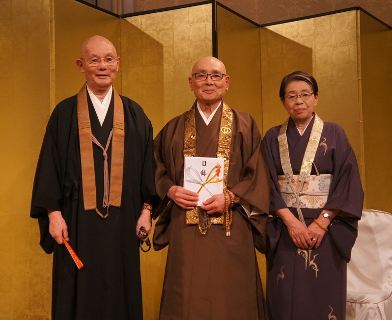 臨床仏教師に認定された關氏(左)と丹羽氏(右)。中央は池田名誉所長(公財)全国青少年教化協議会(全青協)・臨床仏教研究所は12月7日、東京・芝の東京グランドホテル(曹洞宗檀信徒会館)で臨床仏教師認定式を挙行し、第8期を修了した2人に池田魯参同研究所名誉所長(駒澤大学名誉教授)から認定証が授与された。認証者はトータルで24人となった。