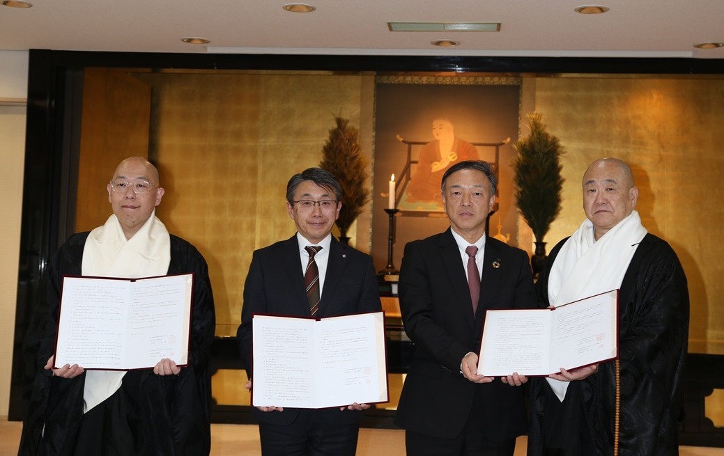 答申書を野口宗務総長に手渡す樋口委員長(左) 臨済宗妙心寺派の令和7年度無住寺院対策委員会(樋口顕龍委員長)が1月26日に京都市右京区の宗務本所で開催された。同派の特徴的な制度「寺院解散補助金」について2カ寺から宗務本所に申請があり、その実情を検討。また宗門活性化推進局と総務部が解散を検討している寺院を視察した状況も報告された。