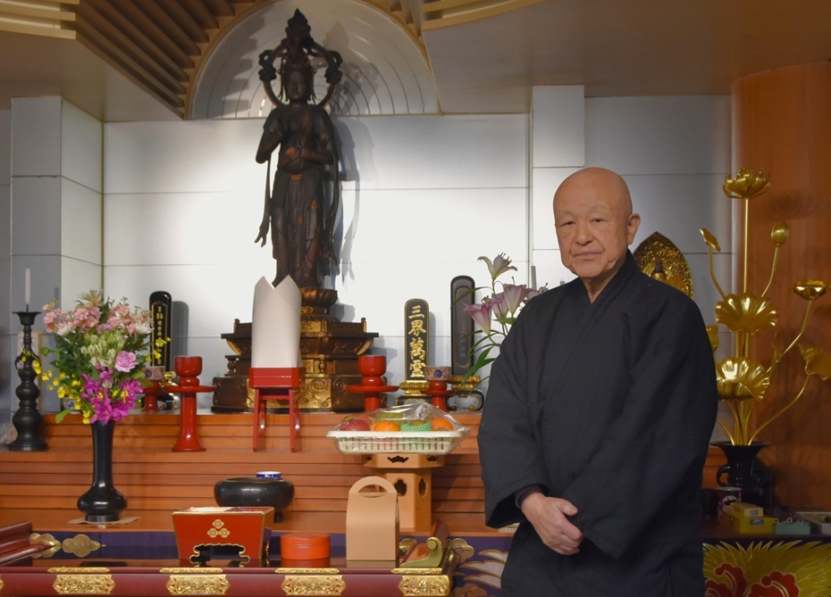 永正寺本堂で宝前に立つ藤木住職 小劇場やライブハウスが集まる東京・下北沢の曹洞宗永正寺。2021年に晋住した藤木隆宣住職(81)は故郷・福井県の日庭寺を2024年末に合併した。上京から半世紀以上。活動拠点は首都圏のため、整理することを決断した。