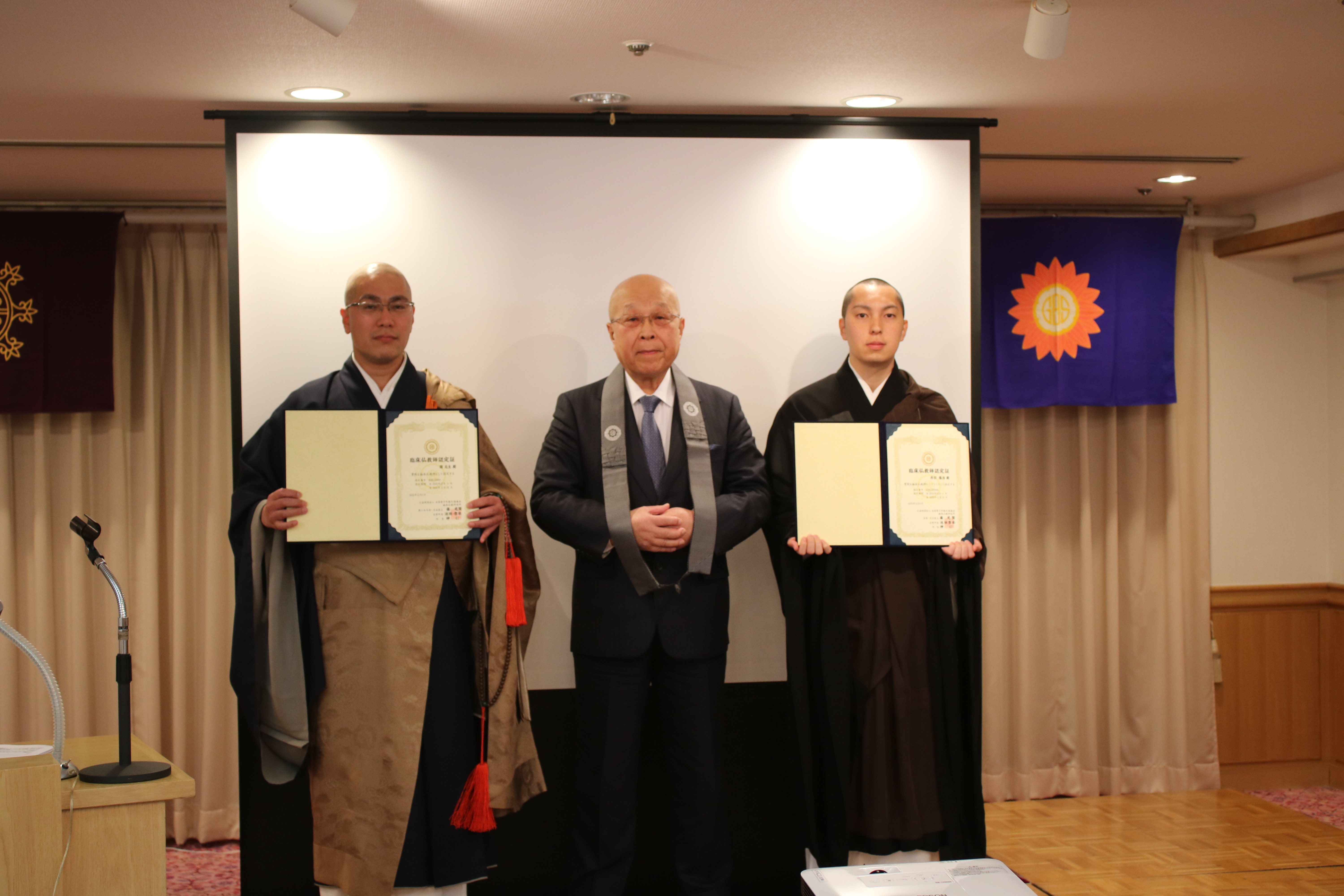 資格を認定されたのは關元生氏(愛媛県西条市・臨済宗東福寺派寿聖寺副住職)と丹羽隆浩氏(埼玉県秩父市・曹洞宗四萬部寺副住職)。およそ3年かけて座学やワークショップ、実践研修などを重ね、生老病死を含む現代社会が抱える諸課題を研さんした。