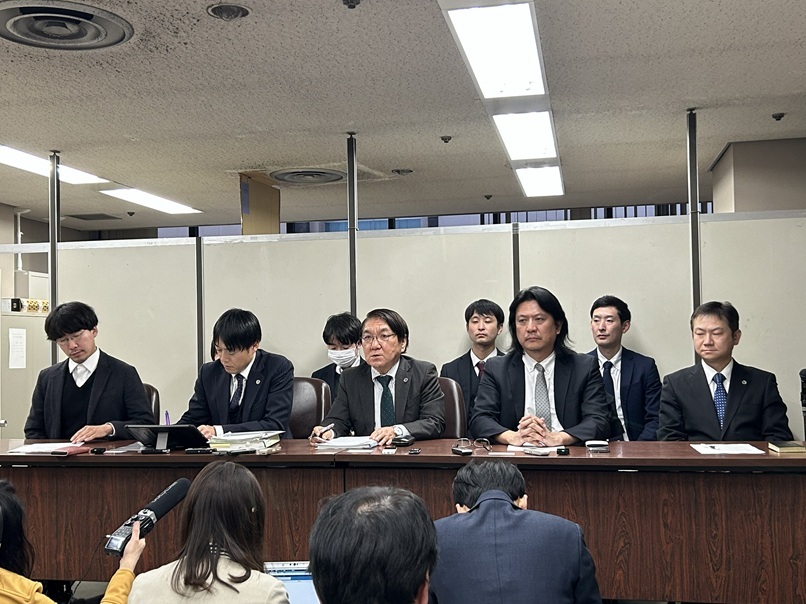 公判後、記者会見する全国統一教会被害対策弁護団。前列中央が村越進弁護団長 宗教2世8人が昨年7月、旧統一教会(現世界平和統一家庭連合、東京都渋谷区)に対して約3億2千万円の損害賠償を求めて東京地方裁判所に提訴。その第1回口頭弁論が1月28日に行われ、原告の1人である野浪行彦氏が意見陳述し、「人間としての尊厳」が生まれつき剥奪されてきたと訴えた。原告代理人の久保内浩嗣弁護士も教団の人権侵害や不法行為を認めるよう主張した。