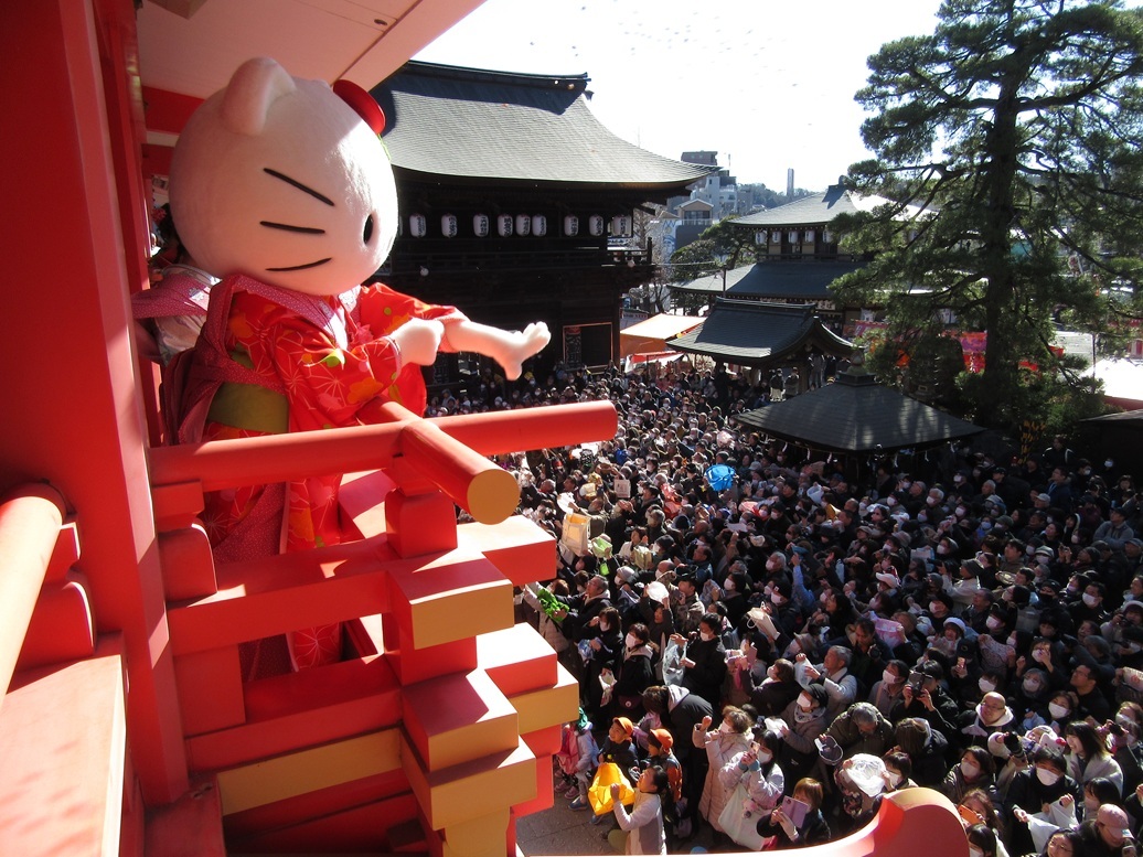 不動堂では杉田貫主を導師に法要を厳修。その後、宝輪閣2階からゲスト陣やはかま姿の年男と年女、日野市の古賀壮志市長らが「福は内!」の掛け声と共に福豆をまいた。大人気のサンリオキャラクターのキティちゃんが登場すると老若男女から「キティちゃーん!」の大きな歓声。「お子様優先位置」が設けられ、近隣の園児たちも訪れた。