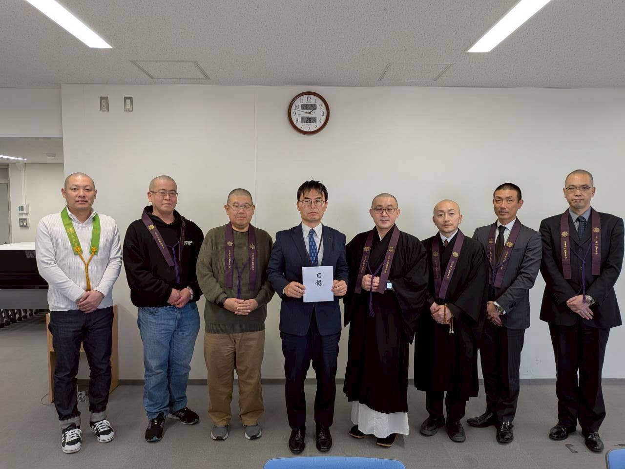 県庁担当者に目録を手渡した全日仏青役員(全日仏青提供) 昨年11月に発生した大分市佐賀関の大火災は死者1名、被災家屋194棟の甚大な被害となっており、復興は緒についたばかり。その支援のため全日本仏教青年会(全日仏青)は1月28日、加盟団体が托鉢した義援金を県庁と被災寺院に届けた。来馬司龍理事長、瀧藤康教救援委員長ら7人の役員が現地を訪れ、被害状況を視察。復興まで長い時間がかかりそうなことを確認すると共に、息の長い支援活動を展望している。